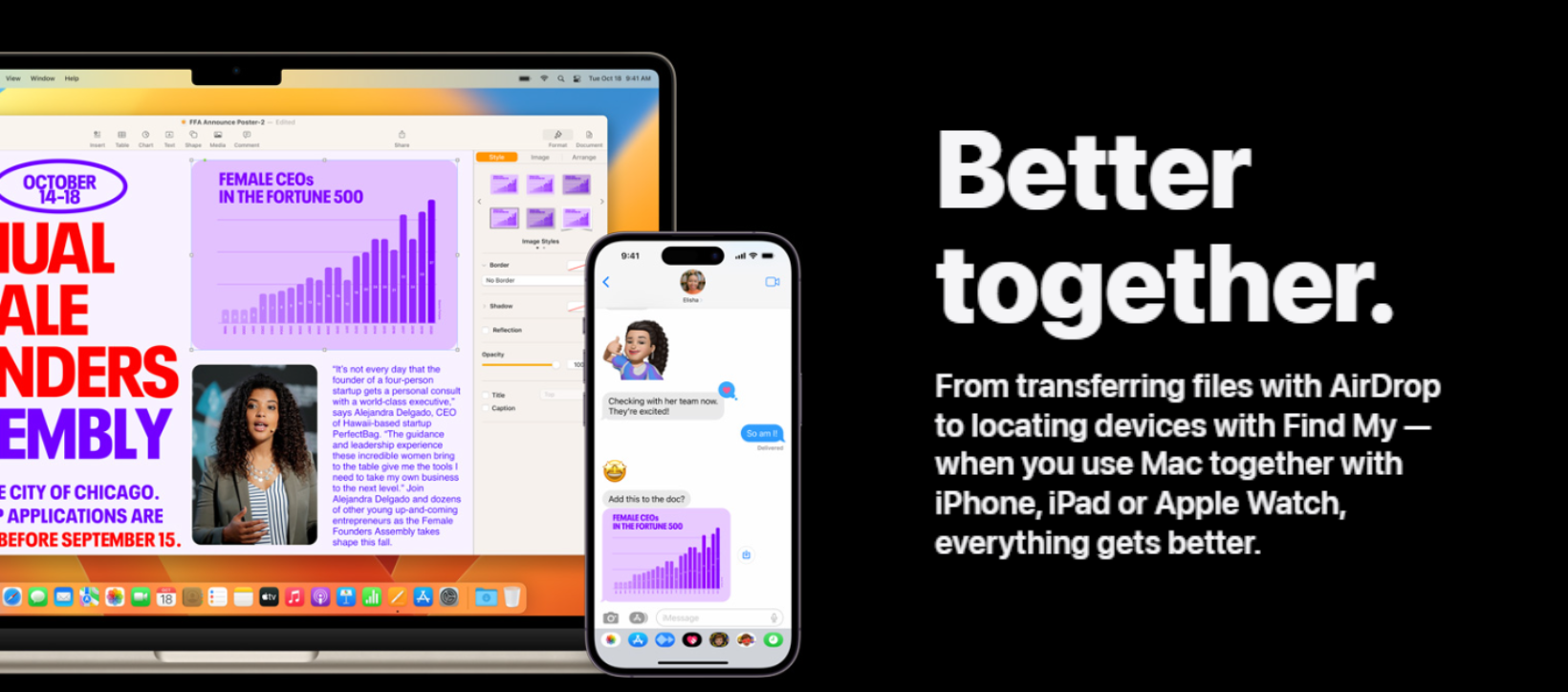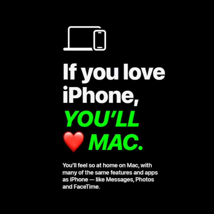 | iMessage Thanks to iMessage, conversations on one Apple device can sync across all your devices. So you can message someone on your iPhone or iPad and keep the conversation going on your Mac. And it works with SMS messages — the ones in green bubbles.6 | Continuity Camera With Continuity Camera, you can use your iPhone as a webcam on your Mac, unlocking features like Studio Light and Desk View for your next video call or live stream. You can also use iPhone to scan documents and insert photos into your work on Mac. |